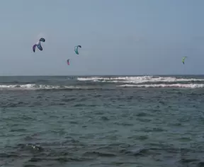 An incredibly beautiful beach with technicolor water, white sand strewn with coral, and colorful kite surfers zooming by, all framed by gorgeous mountains.