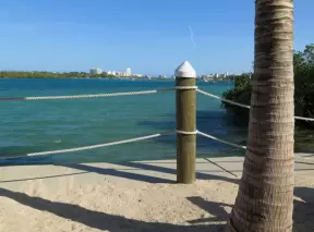 Pretty park along the intracoastal waterway near high rises, with walking paths, playground, gazebos, fountain, and tennis courts.