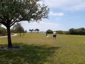 Beautiful lakefront park with wide walking paths, lighthouse, water lilies and other water flowers, birds, large playgrounds, and marina.