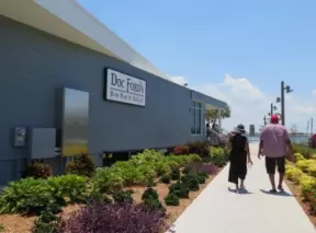 Waterfront area with restaurants, live street performers, entertainment, toy stores, and carousel.