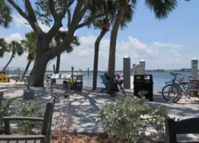 Waterfront park with amazing colors in the water- views of an island and blue-green sandbars. Plenty of benches and docks, and a playground.
