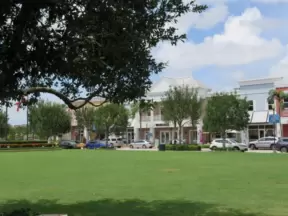 Town with splash pad on the lake, town square with cafes, playground, and lots of stores.