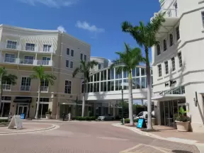 A happening spot with a sunken amphitheater by the water where kids can run in a splash pad and fountains are lit up at night. BurgerFi, Subculture Coffee, and a few restaurants.
