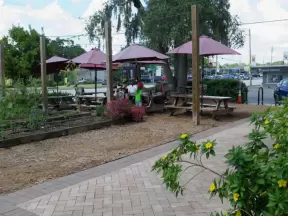 Trendy area with coffee shop, beer garden, wine bars, and cider bar, in industrial-style architecture with murals.