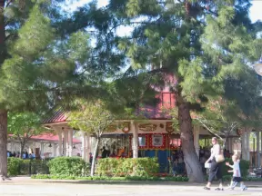 An outdoor mall under a huge banyan tree hung with lanterns. Beautiful flowers by a stream, rock-like seats kids love, and rain fountain.
