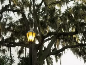 Short walk around shimmering lake with moss-draped trees, past Spanish mansions.
