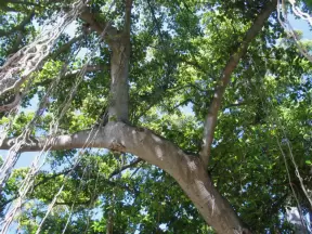 Sports fields and walking trail beside a banyan tree grove, in a city area.