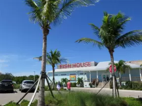 Main block with tropical-themed cafes and views of the water, plus a coffee shop and gift shops in little houses.