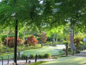 Mini-golf park with lush, colorful grounds, plus arcade games, mini-carousel, and rides.