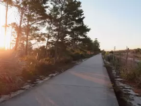 Very wide cement path through lovely white-sand forest! There is also a narrow, unpaved path that is lovely.