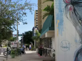 Main strip of West Palm Beach, with colorful and inviting architecture and decorations.