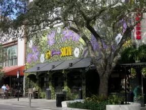 Main strip of West Palm Beach, with colorful and inviting architecture and decorations.