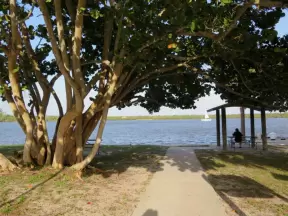 Waterfront park with amazing colors in the water- views of an island and blue-green sandbars. Plenty of benches and docks, and a playground.