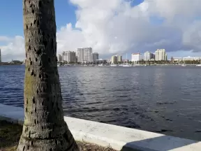 Wide walking path along the water with tropical flowers, piers, grand high rises, and palm trees- no shade though.