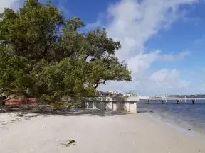 Large lagoon with clear water where kids can swim, tons of shade, and playground in the sand.