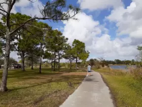 Tropical paradise with amazing trees, soft green grass, and woven huts shading picnic tables with BBQs that line the river, plus bike and kayak rentals. Beware alligators.