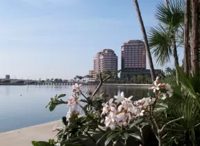 Wide walking path along the water with tropical flowers, piers, grand high rises, and palm trees- no shade though.