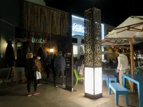 A small, attractive shopping center with cafes, boutiques, a coffee shop, a farmers market, and nice lights at night.