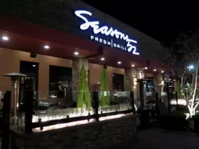 Shopping center close to the freeway, with a Barnes and Noble Bookstore and some cafes with flower planters and space outside where kids can run around.