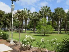 Small, gorgeous park with old trees, tropical plants, flowers, roses, and a pond with koi and turtles.