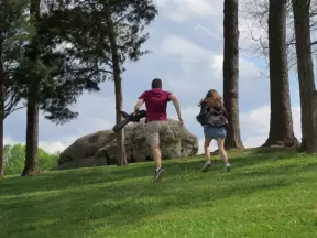 Stinky park downwind from a huge garbage dump with pony rides, horse trail rides, bounce house, steam train rides, and playground.