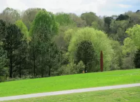 Paved greenway with tall trees that leads to Merritt's Pasture, a field. Stinky sewer in summer.