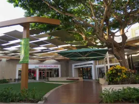 An outdoor mall under a huge banyan tree hung with lanterns. Beautiful flowers by a stream, rock-like seats kids love, and rain fountain.