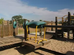 Modern playground with Chumash Indian huts and canoe, seals and whales to climb, roller slide, rainbow bridge, and bald eagle in a nest.