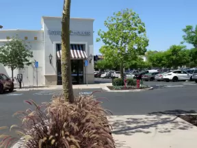Modern shopping plaza with flower pots, Shake Shack, Trader Joe's, and Clean Juice.