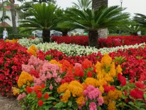 Beautiful garden with many partitioned areas, tropical plants, flowers, all with the blue lake behind. Plus, promenade around the lake.