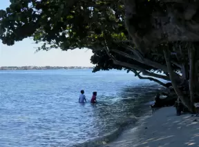Large lagoon with clear water where kids can swim, tons of shade, and playground in the sand.