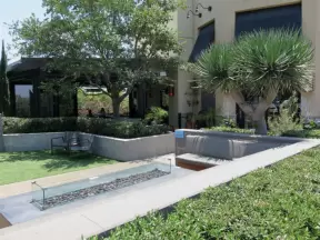 Spanish-style shopping center with chic people having coffee by the outdoor fountain.