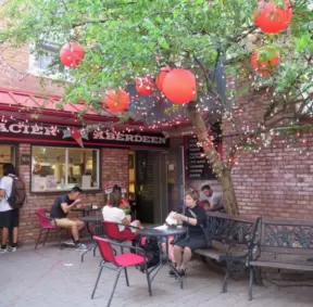 Hip area with wine bars, cafes, and bakeries, where you can sit on a patio surrounded by ivy-covered walls.
