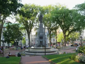 Large square park filled with tall, old trees, looking down on the happy vibes of Dufferin Terrace and the blue river below.