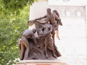 Impressive, stately building atop a hill, with lovely gardens and statues, and a fountain in the middle if the street.