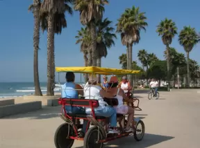 A popular bike path along the shoreline with bright beach succulents and rows of perfect California palms!