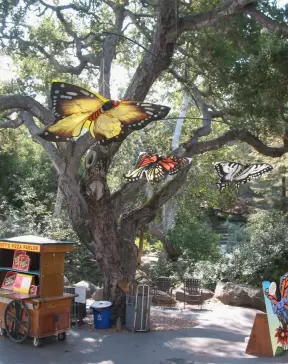 Whimsical sculptures of fairy tale scenes in the middle of a giant oak forest with Spanish moss and vines. Magic!