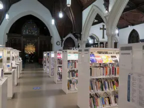 Beautiful, modern cathedral with colorful statues, the twelve stations of the cross, bright stained glass, light-filled rotunda, and amazing organ.