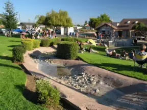 A remarkably pretty planned park with a stream that runs through it, lots of plants, an imaginative Spanish playground, and whale statues that spout water!