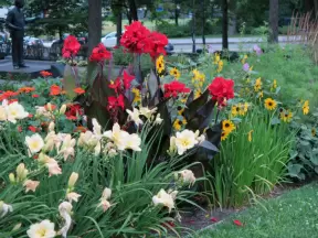 Incredible, large garden near the Sorbonne with flowerbeds, palace, circular pool with toy boats, statues, and tree canopies.