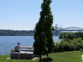 Wonderful spot along the river, with happy people biking and roller blading by. Observation tower with sweeping views.