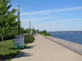Wonderful spot along the river, with happy people biking and roller blading by. Observation tower with sweeping views.