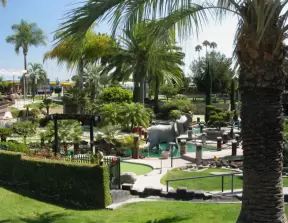 Mini-golf park with lush, colorful grounds, plus arcade games, mini-carousel, and rides.