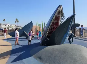 Modern playground with Chumash Indian huts and canoe, seals and whales to climb, roller slide, rainbow bridge, and bald eagle in a nest.