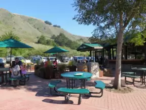 Upscale, colorful plaza in farmhouse style, with modern cafes. Kids climb on a huge log. The fire pit is fantastic at night, surrounded by eucalyptus trees.