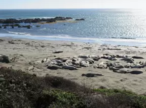 From a boardwalk, you can see a beach absolutely covered in massive elephant seals, and sometimes their babies.
