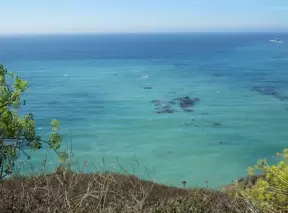 Lawn over cove with glorious views of clear, blue-green water. Nearby, gently-curved rocky outcroppings.