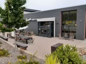 Upscale, colorful plaza in farmhouse style, with modern cafes. Kids climb on a huge log. The fire pit is fantastic at night, surrounded by eucalyptus trees.