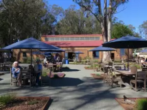 Upscale, colorful plaza in farmhouse style, with modern cafes. Kids climb on a huge log. The fire pit is fantastic at night, surrounded by eucalyptus trees.