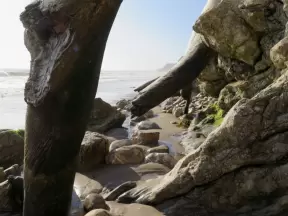 Rugged, beautiful cove with interesting rocks, sea glass, and shells on shore. Rock to climb, and water rushing into cove.